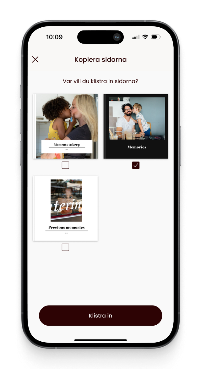Du skal blot stryge opslaget til højre og trykke på Kopiér. Vælg derefter den eller de bøger, hvor du vil have din side indsat. Dit kopierede opslag overføres til bunden af den valgte bog.