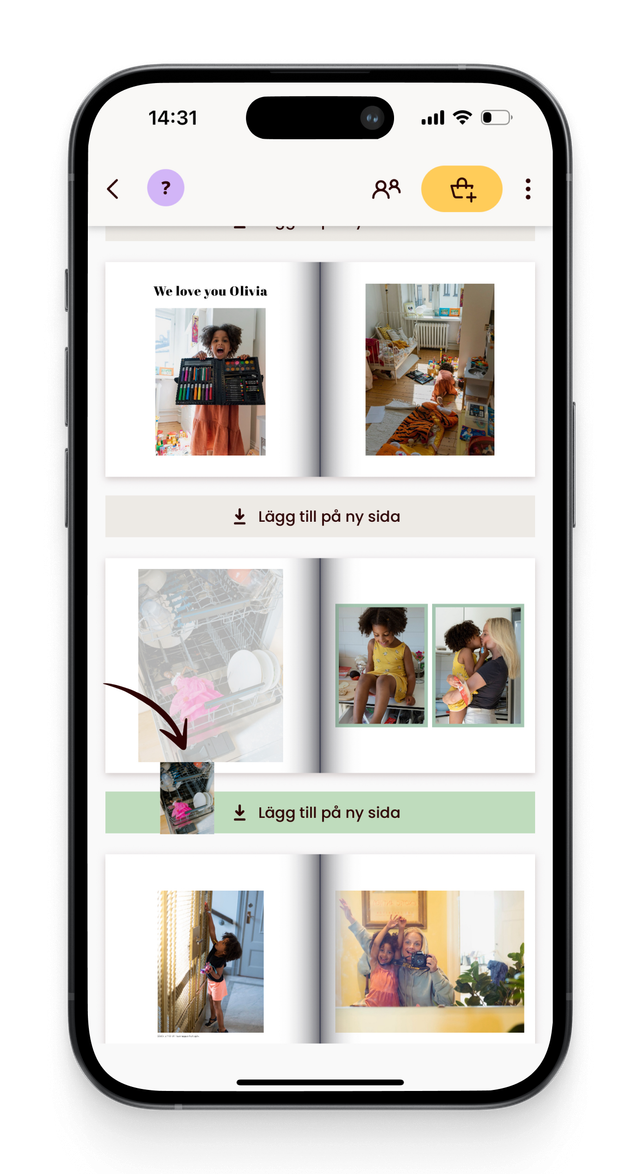 I bogvisning kan du også flytte et billede til en ny side ved at slippe det på knappen "Føj til ny side" mellem to sider. Dette vil oprette en ny side til dit billede.