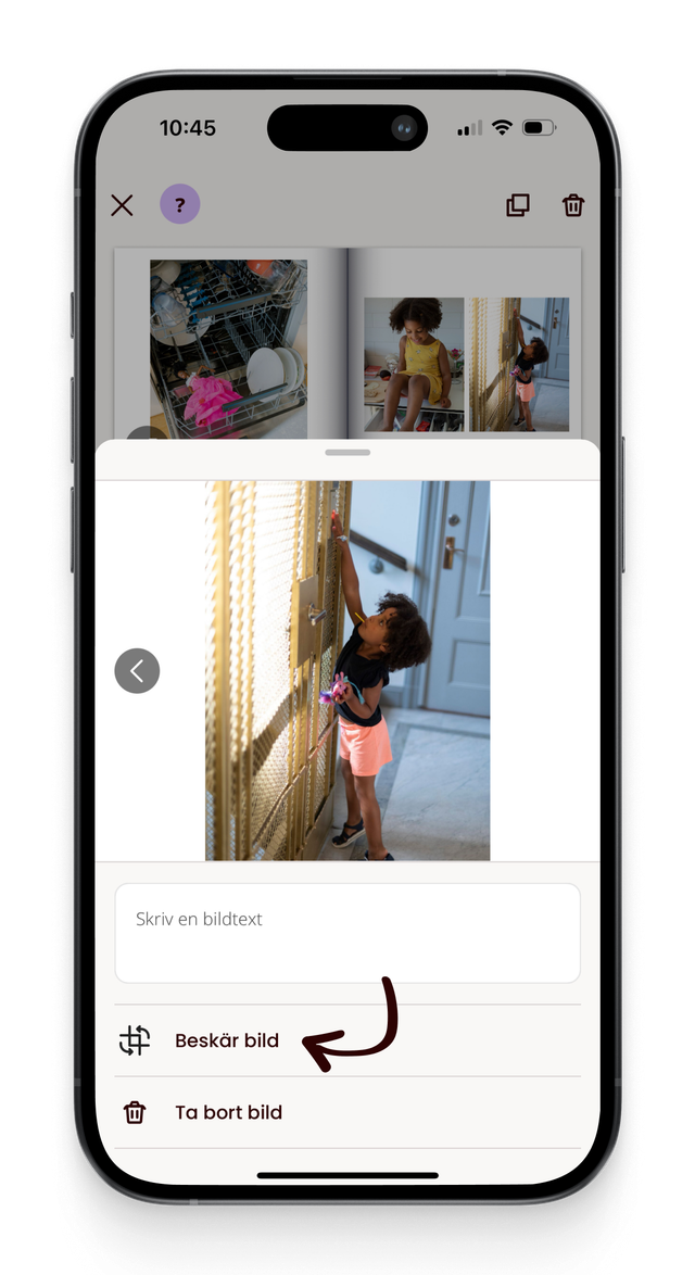 Du beskærer et billede ved at trykke på det i dit opslag og vælge ”Beskær billede”. Du kan zoome ind eller ud på billedet med dine fingre, rotere det 90 grader eller fintune rotationen ved hjælp af skyderen. Du kan også skifte mellem formaterne portræt, landskab og kvadratisk. Når du er tilfreds med justeringerne, trykker du på fluebenet for at gemme.
