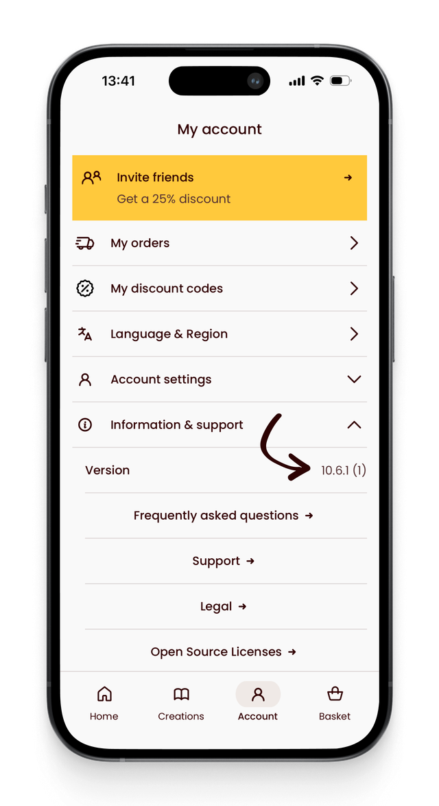 Gehe zu Konto > Informationen & Support. Dort siehst du, welche App-Version du verwendest.