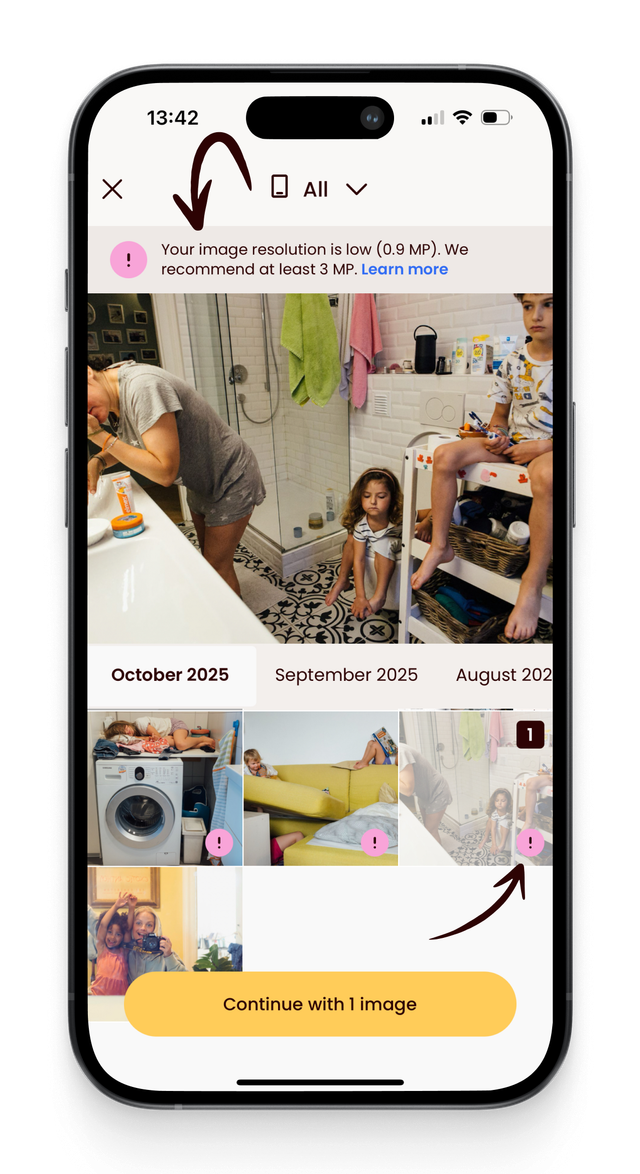 Wenn ein Foto eine Auflösung unter unseren empfohlenen 3 Megapixeln hat, erscheint ein Ausrufezeichen neben dem Foto.