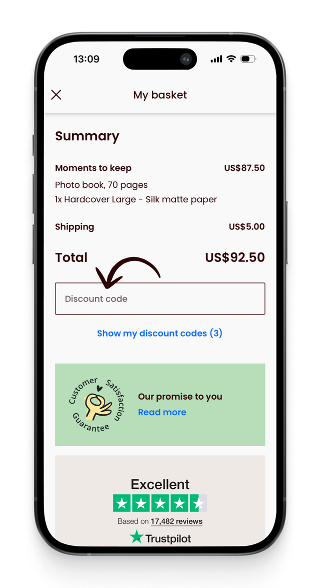 Añade el código promocional justo después de donde se encuentra el precio final, en el apartado dedicado a códigos de descuento.