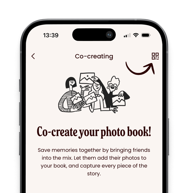 Fai clic sull’icona che assomiglia a un codice QR nell’angolo in alto della videata. In tal modo si crea un codice QR esclusivo per questa co-creazione. Puoi salvare il codice QR come immagine o stamparlo direttamente. Il codice QR è perfetto per i grandi eventi, cioè se desideri creare un fotolibro insieme a tante persone.