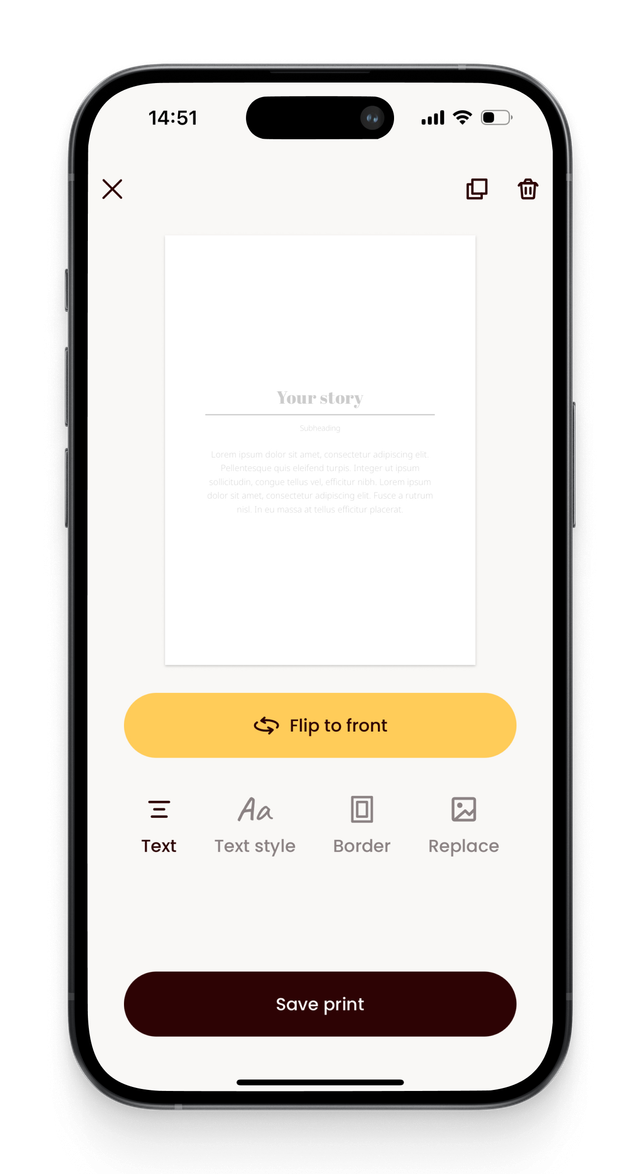 Sì, sul retro puoi aggiungere un titolo, un sottotitolo e un testo. Tocca il pulsante che gira la stampa per accedere al retro.