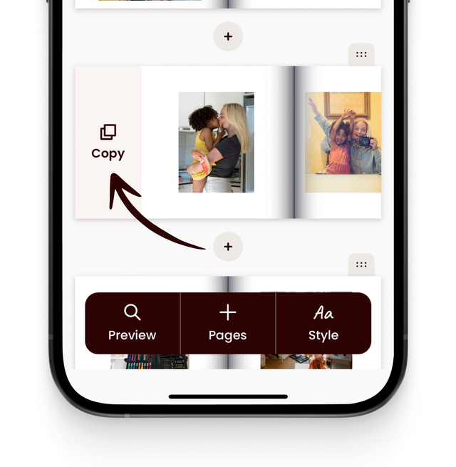 Swipe je spread naar rechts en tik op Kopiëren. Selecteer vervolgens het boek of de boeken waarin je de pagina wilt plakken. De gekopieerde spread wordt onderaan het geselecteerde boek geplaatst.