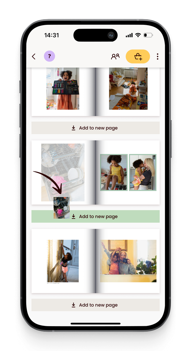 In de boekweergave kun je een foto ook naar een nieuwe pagina verplaatsen. Sleep de foto naar de knop “Toevoegen aan nieuwe pagina” tussen twee spreads en laat los. Voilà – je foto krijgt een gloednieuwe pagina voor zichzelf.