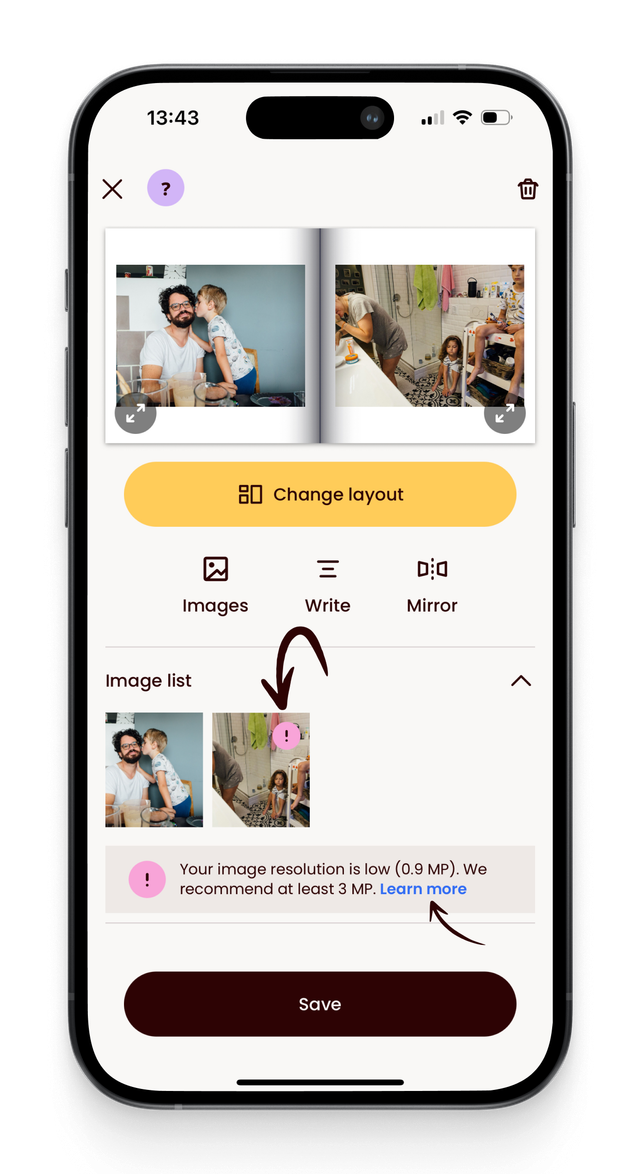 Het uitroepteken geeft aan dat de foto een lage resolutie heeft, minder dan 3MP, wat betekent dat 'ie waarschijnlijk wazig of korrelig zal worden afgedrukt in het boek.