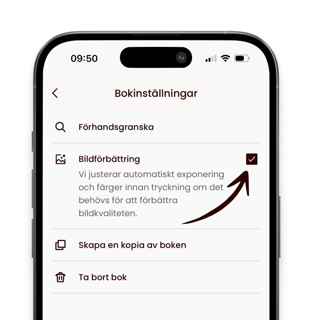 Hvis fotoboka inneholder bilder som er redigert av fagfolk, anbefaler vi at du slår av bildeforbedring for å bevare redigeringen som er gjort. Denne innstillingen gjelder for en hel bok.